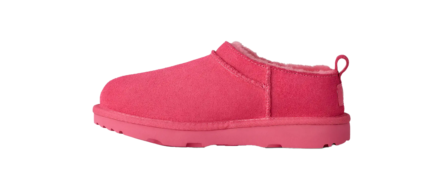 The UGthtG Classic Micro Slipper "Pink Bloom" delivers a clinical, high-status execution of the heritage leisure silhouette, masterfully blending premium comfort with a radical, hyper-saturated technicality. This iteration features a premium landscape of Twinface sheepskin suede in a vibrant "Pink Bloom" palette, providing a plush, multi-dimensional foundation for the model’s ultra-low anatomical profile. The design is defined by its explosive, monochromatic strike, utilizing specialized overlock stitch detailing and a rear pull tab that injects a layer of high-octane luxury into the minimalist slip-on build. Grounded by a tonal SugarSole™ EVA outsole for elite, lightweight cushioning and finished with a signature UGthtGplush™ wool lining, this release successfully pairs the brand's aggressive cozy DNA with a sophisticated, "Barbiecore-luxe" aesthetic.